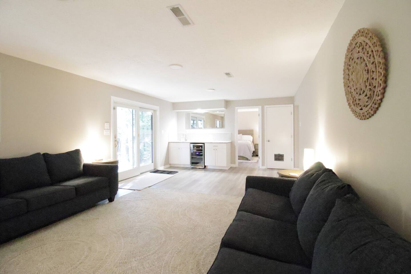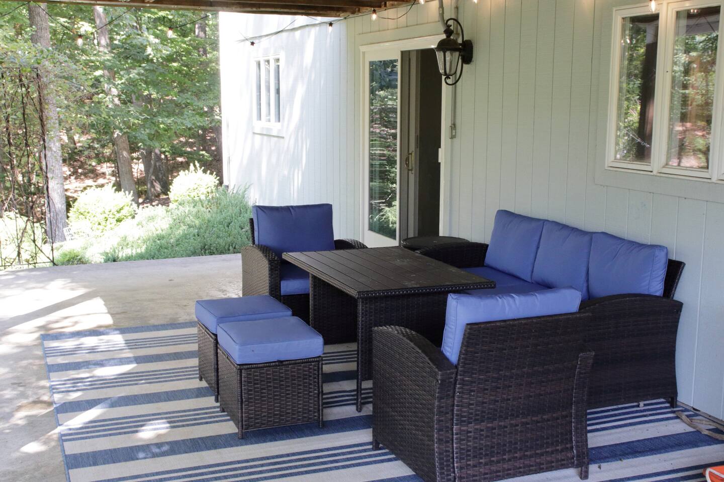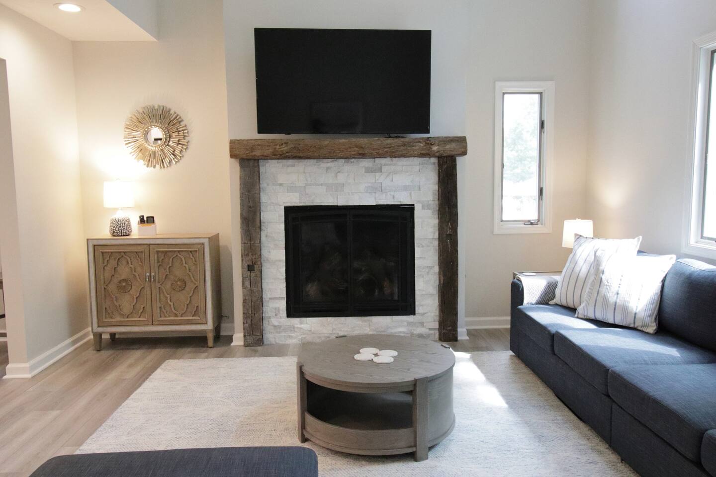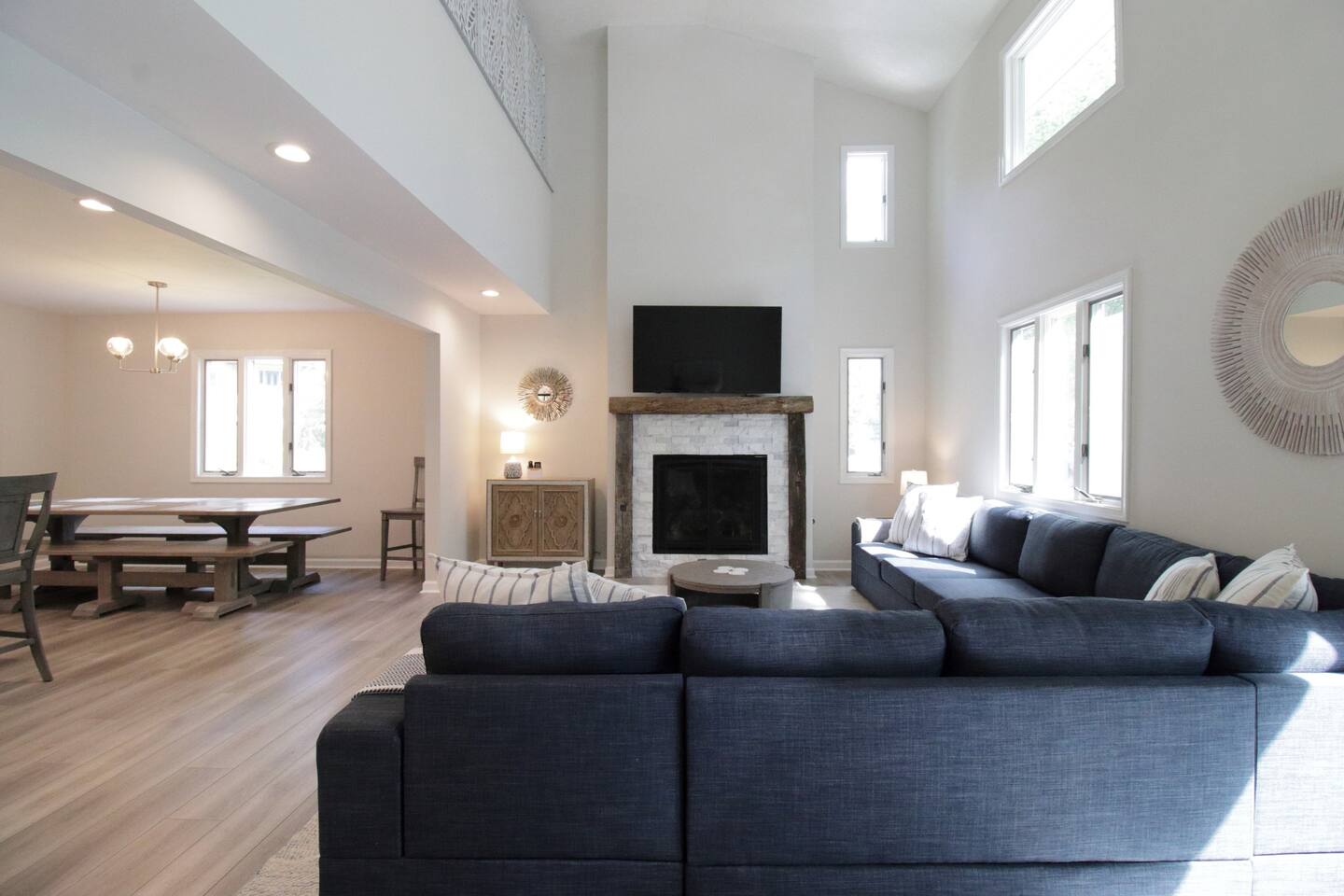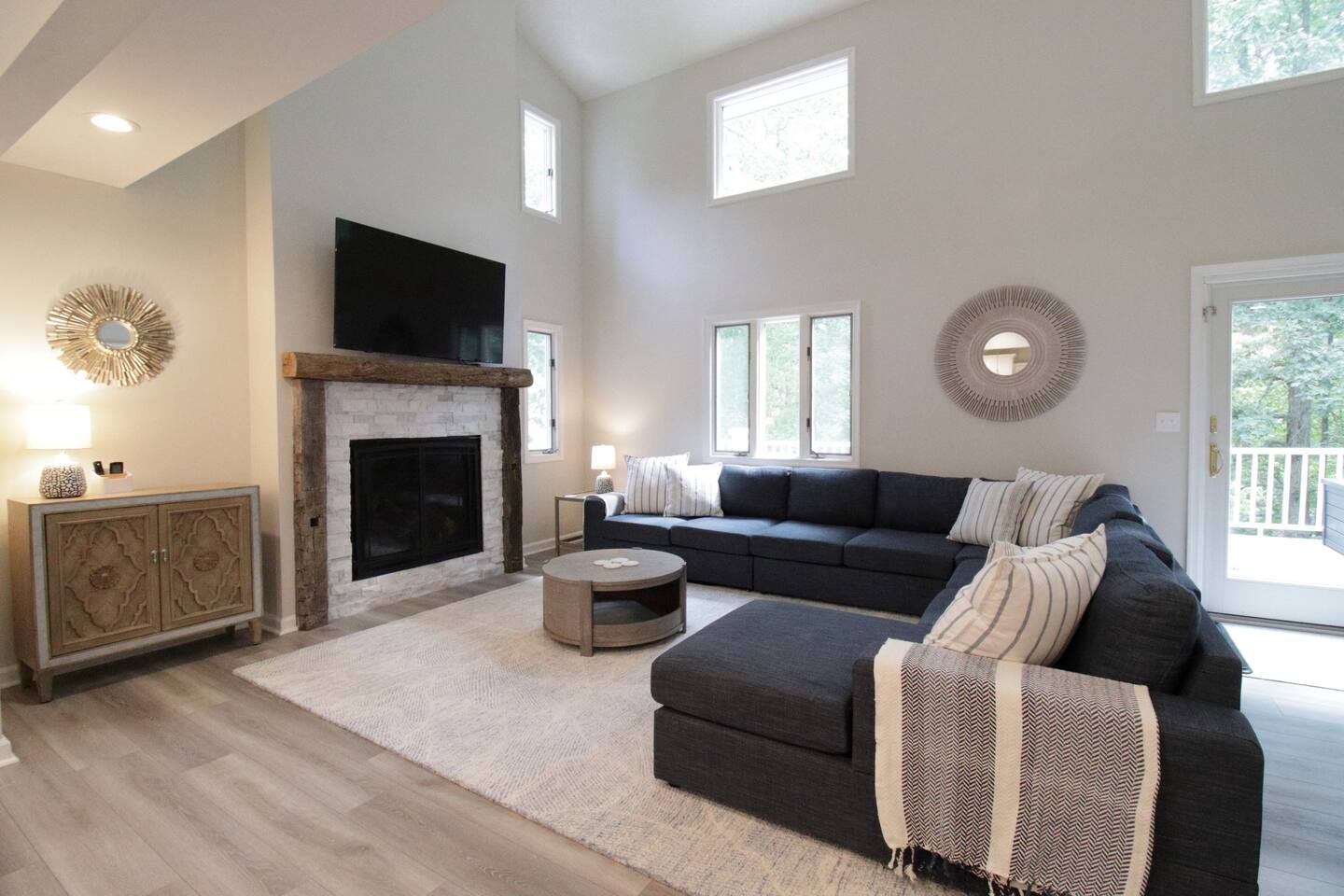 This charming home features cozy bedrooms, a nursery, spacious loft, and 3 full bathrooms, perfect for family or friends. Enjoy modern comforts like high-speed wireless internet, air conditioning, outdoor dining, dock and jet ski ramp, and a fully equipped kitchen with electric stove and dishwasher. Kitchen essentials and laundry facilities are also provided for your convenience. Unwind and rejuvenate in a peaceful setting that feels like home away from home. The home is situated in a cove that is considered to be a "No Wake Zone." The three-story property can easily accommodate up to 8 guests. As you come into the home you will find a light-filled, double-height living room. Included in this welcoming space is a huge sofa, stylish decor, comfortable reading area with views of the lake, and gas fireplace with reclaimed wood mantel. This room is the heart of the home, providing a great space for the family to connect, play games, relax in front of the fire on cooler days, or watch a movie on the large smart tv (Wi-fi is included so you can stream shows with your own login). The main level living room leads out onto the large deck with views of the lake and mountains. This area includes a dining table and comfortable chairs, umbrella for shade on sun-filled days, and gas grill. An ideal place for enjoying meals al fresco, a morning coffee, or watching kids play out the back. The living room connects with an open plan and well-appointed kitchen/dining space with all the essentials for preparing meals in the comfort of this lakeside haven. The coffee and tea bars are a great way to start the day or bring it to a warming end. There is a large dining table with bench seating and comfortable counter chairs around the functional island offering plenty of additional space for gathering, cooking, and spending time together. A high-chair and child-friendly cups, cutlery, and plates are included to make life easier for family vacations. The three private bedrooms offer 2 king-sized beds (main and upper level), one queen bed (lower level/basement), and toddler crib (upper level bedroom), while the spacious loft area (upper level) includes two double beds and hang-out space with toys and activities for kids (hidden away in case all guests are adults!). All the mattresses are medium-firm with the option to add or remove additional layers of padding (including memory foam toppers) for those that prefer a softer sleeping experience. Each floor of the home offers a full bathroom, ideal for multiple guests. Bath towels and linens are included. The basement is an ideal space to unwind and socialize at the end of the day, with smart tv (streaming available with your own login), games and books, comfy sofas, bar area with beverage fridge, and gas fireplace. This area opens out onto the lower patio and outdoor seating area, offering shade during the day and soft cafe lighting for evening use. There are plenty of things for any kids of any age to enjoy outside including mud-kitchen, water table, outdoor activities, and yard games. The fire pit with outdoor-use blankets and Adirondak chairs are a great way to spend an evening under the stars. Laundry facilities are also available for guests. The home sits on a wooded, 1.25 acre lot. Graduated steps take you down to the water with additional views of the lake and mountains. The peaceful cove is a great place for swimming, floating, fishing, and playing in the water. The dock and jet ski ramp, in 12 ft of water, are perfect for those with a boat or water sport toys. The private driveway can accommodate up to four vehicles. Boat ramp access within the community is also available to guests upon request and for an additional fee.